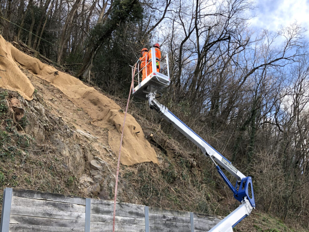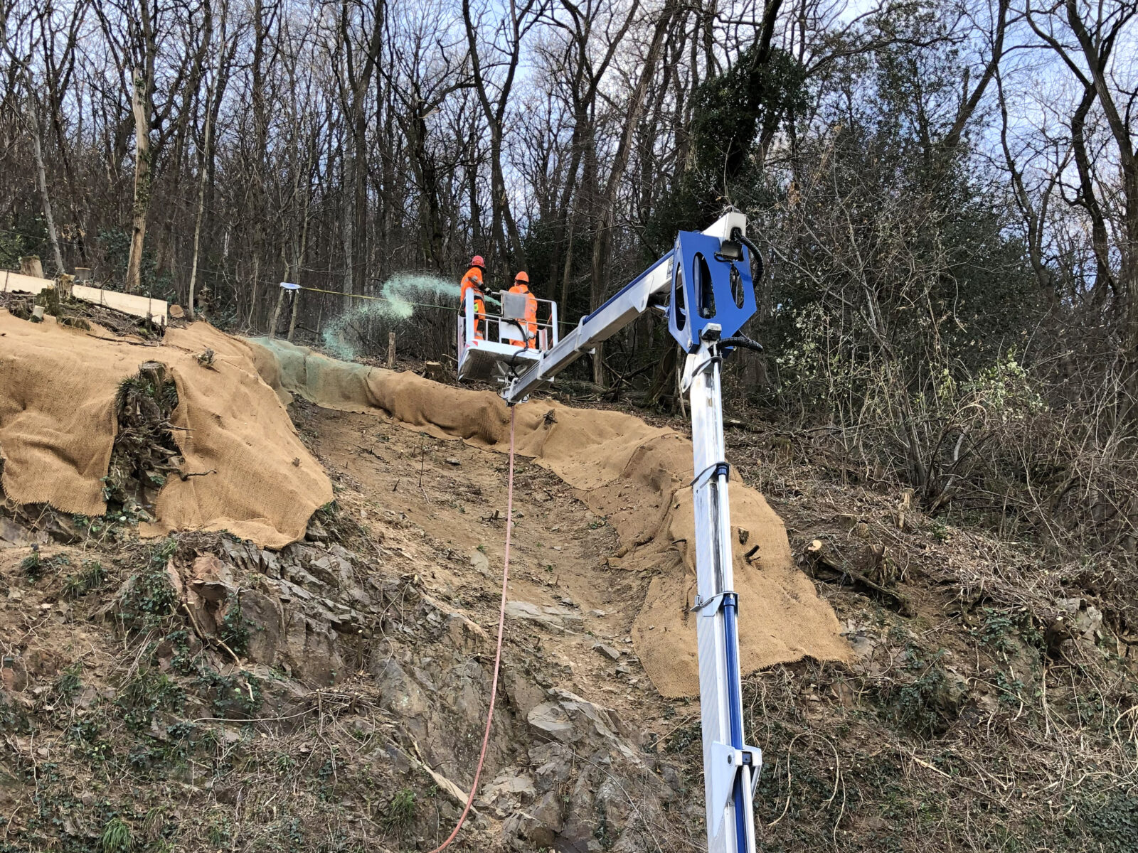 Holzschlag, Kokosverlegung und Hydrosaat mittels Mobilkran mit Hebebühne.