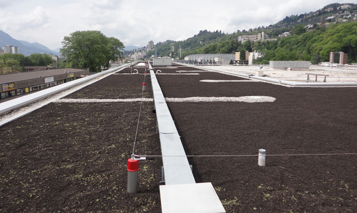 anschliessender Nassansaat. Kiesstreifen am Dachrand und an Wassereinläufen anlegen.