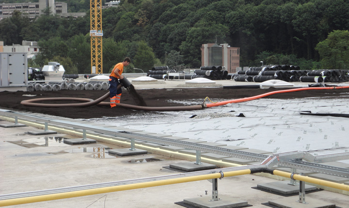 Extensive Dachbegrünung mit Substratförderung- und Verteilung und