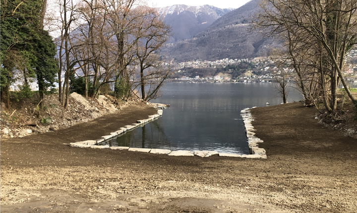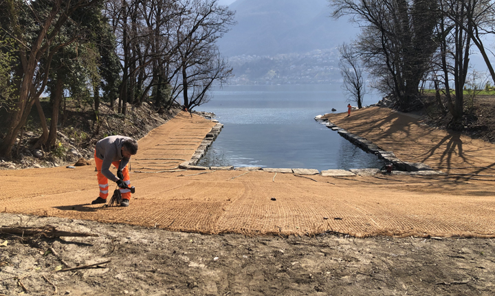 Die neu erstellten Erdflächen bei Mittel – und Hochwasserspiegel des Locarnosees vor Erosion und Abschwemmung schützen.
